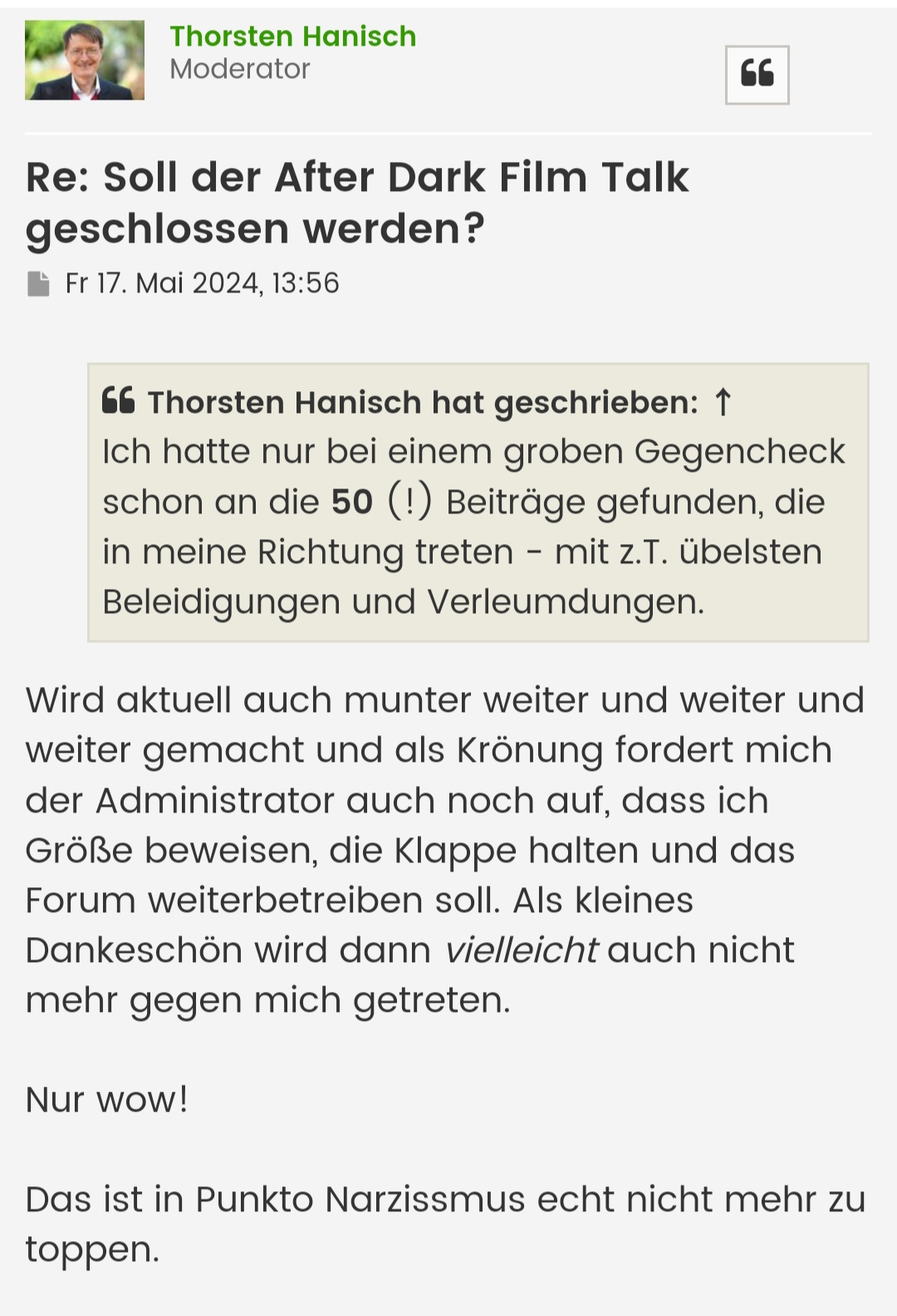Für mich war am Ende nicht das Offtopic-Gezanke ausschlaggebend, aus dem ich mich zu dem Zeitpunkt bereits (soweit möglich, weil es sich ja durch alle Threads zog) zurückgezogen hatte. Sondern die Tatsache, dass der große Filmjournalist H. - der in seinem eigenen Filmforum bereits seit Jahren nicht mehr über Filme schrieb, sondern nur noch kommentarlos Links zu Texten auf Drittseiten ablud - für einen seiner honorierten Artikel einen Absatz aus einem meiner Posts verbatim kopierte und dies daraufhin trotz der für alle offensichtlichen Sachlage abstritt. Ich bot ihm dann an, dass wir mit einer simplen Entschuldigung und Änderung Schwammdrüber machen können. Da lehnte er wie zu erwarten ab und es folgten die üblichen Diffamierungen.
